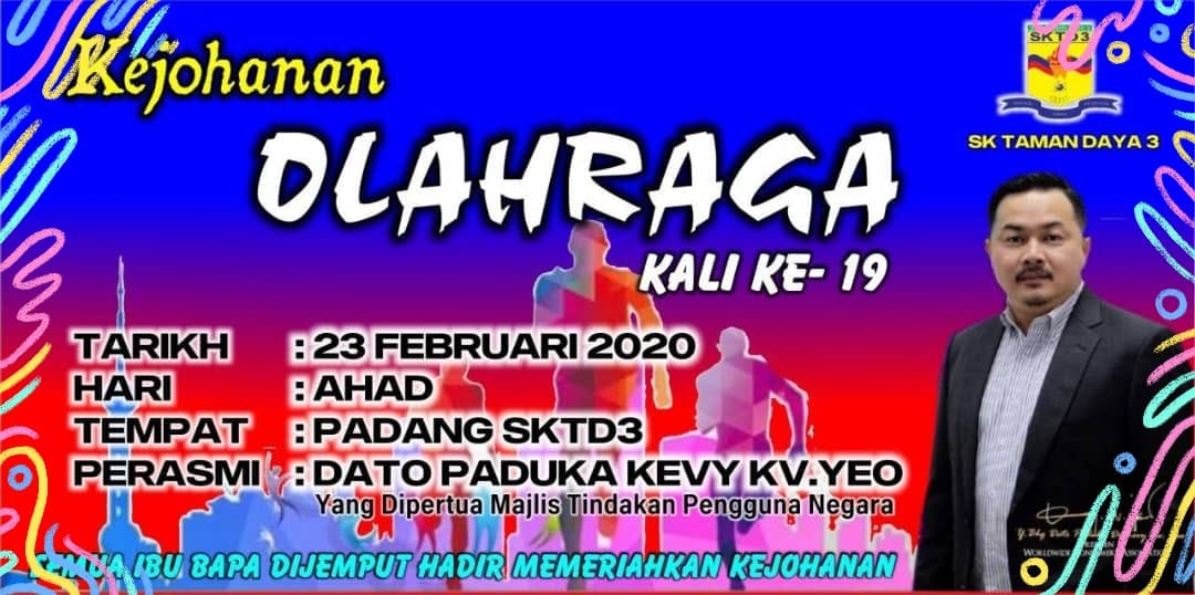 Kejohanan Olahraga Kali Ke-19, Sekolah Kebangsaan Taman Daya 3 Johor Bahru, 23 Februari 2020 - YBhg. Dato Paduka Dr. Kevy KV Yeo (Presiden MTPN) telah merasmikan Kejohanan Olahraga SK Taman Daya 3 kali ke-19 bagi tahun 2020 yang telah berlangsung dengan jayanya. Kejohanan ini merupakan salah satu program utama aktiviti kokurikulum tahun 2020 kategori sukan dan permainan di SKTD3. Temasya Kejohanan Olahraga ini diadakan bagi mempertingkatkan lagi tahap kecergasan murid di samping melaksanakan program 1 Murid 1 Sukan (1M1S) yang dihasratkan oleh Kementerian Pendidikan Malaysia. Melalui program ini juga, dapat memantapkan serta meningkatkan pengetahuan murid dalam sesuatu bidang sukan di sekolah. Selain itu, para